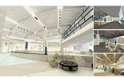The Design process was exercised through a combination of hand-sketch and SketchUp 3D modelling. For a multi layered environment this process revealed exciting possibilities to capture viewpoints within its macro-context and discovering nuances at the pedestrian level. The chosen result became a radiating suspended feature ceiling that dissected a clerestory to then reveal itself as a facade along an elevated "High-Line" park. The reversal reading of this solution we felt was quite strong. without over dominating the Main Mall's feature triangulated "Novum" skylight.
